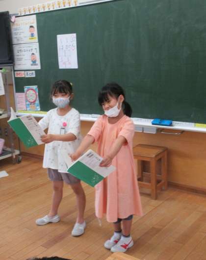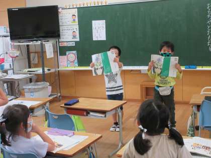 国語では、ひらがなの学習が終わり、いろいろな言葉の学習をしています。今日は、ペアで一緒に音読の練習をして、発表しました。みんな上手に読むことができて、うれしそうでした。