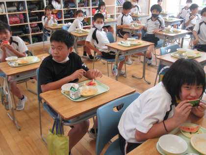 今日の給食に、すいかが出ました。子供たちは美味しそうにすいかを食べながら、夏の訪れを感じていました。おかわりをめぐるじゃんけん大会も白熱しました。