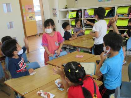 算数では、たし算カードを使って練習しています。今日はグループで、カードを使い、問題を出し合いました。みんなで楽しく練習をして、たし算名人を目指します!