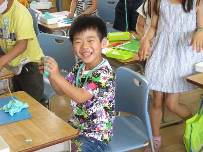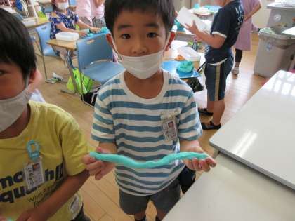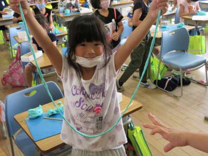 先日、図工で「ひもひもねんど」に挑戦しました。粘土全体をこねて、粘土の感触を十分に楽しんだ後、細長いひもを作りました。子供たちは、「おもしろい!」「どんどん長くなるね」と、声を上げていました。次回は、この長いひもを使っていろいろなものを作る予定です。