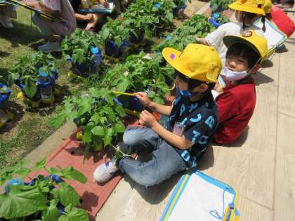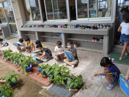 朝顔がとても大きく成長し、本葉が増え、つるも出てきました。子供たちは、「本葉が顔くらいの大きさだよ」「つるがにょきにょき出てきたね」など、言いながら観察していました。今度は、花が咲くのを楽しみにしています。