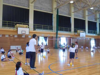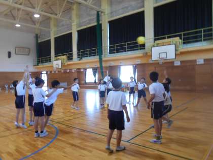 体育の学習では、ソフトキャッチバレーボールをしています。友達とボールをつなげられるように、ボールの高さやボールを打つ強さ等を調節しながら、楽しく活動しています。