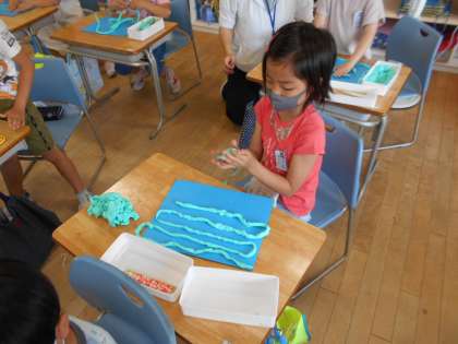 最後は、自分だけの「ひもひもワールド」を作ってねんどあそびを楽しみました。