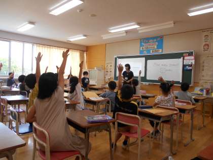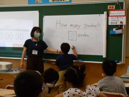 外国語活動で、数を尋ねる「How many 〜?」を学習しました。この文を使って、画数から漢字を考えるクイズを出し合いました。クイズ中も「Hint please.」と英語が飛び交い、どんどん英語を言おうというやる気が感じられました。