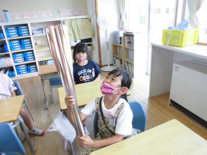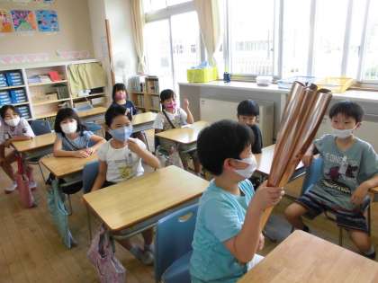 オリンピックの聖火ランナーに選ばれた卒業生の先輩から、本物のトーチを貸していただきました。実際に見たり持ったりした子供たちは、「すごい!」「重いなあ」「上の部分が桜の形になっていて綺麗」と喜んでいました。とても貴重な経験ができました。
