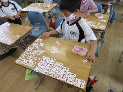 算数で引き算の勉強をしています。計算カードを並べて、練習を始めました。引き算名人を目指します!