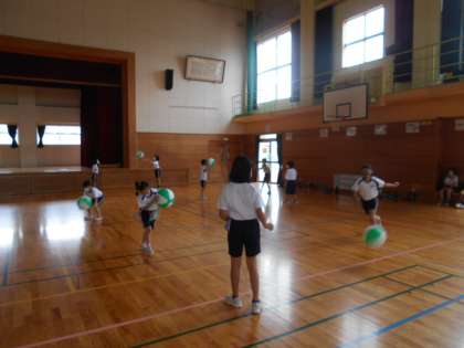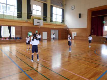 体育の学習では、新しくボール運動を始めました。ボールをキャッチして、バレーボールのようにつないでいきます。今日は初めての学習でしたが、声をかけたり、話し合ったりしながら、グループでどんどんラリーをつないでいました。