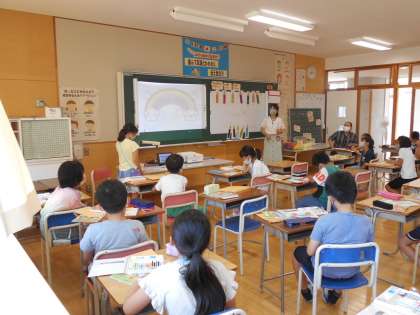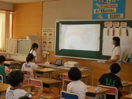 今週の外国語活動では、自分の好きな色で虹の色塗りをして、選んだ色を「I like 〜.」と友達に伝え合いました。外国語活動では、話したり聞いたりと、友達と関わり合って学習しています。