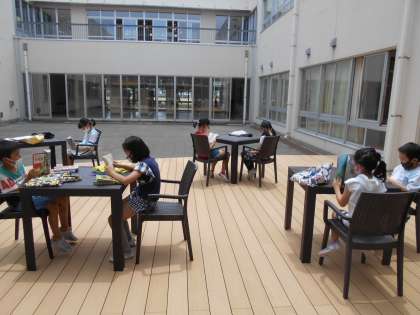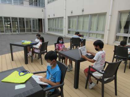 図書室横の中庭にくつろぐことができるスペースができたので、図書室で本を借りた後、そこで読書をしました。心地よい風を感じていました。