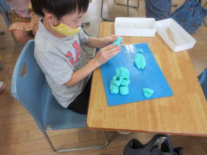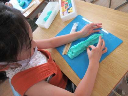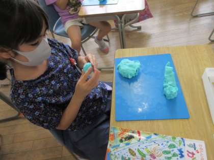 ねん土をにぎって、できた形をじっくり見てみました。何に見えるか想像しながら、つくりました。いろいろなにぎりかたをためしながらつくりました。