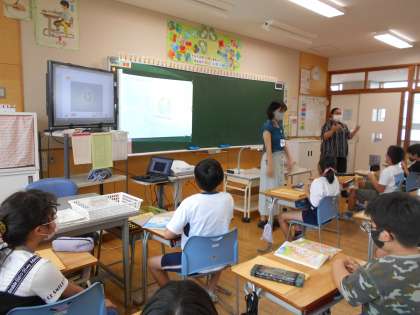 子供たちは荒谷先生とルエラ先生と一緒に楽しみながら英語を使っています。1学期最後の学習では、時間の言い方を練習したり、何をする時間が好きかを友達に伝えたりしました。