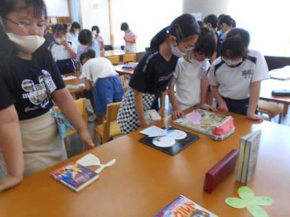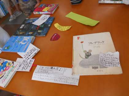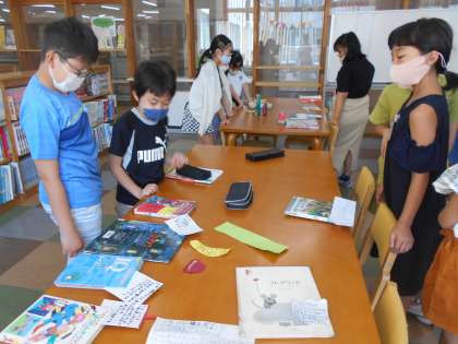 子供たちは、図書室の本から好きな本を選んでポップをつくりました。友達のポップと本を見合い、「読んだことある本も、友達の感想は違うから、また読みたくなった」と友達と見合うよさに気付いていました。