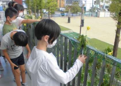 ヘチマの雄花、雌花の観察をしました。花のつくりを丁寧に観察したり、おしべの先の花粉を指の先に付けて詳しく見たりしました。