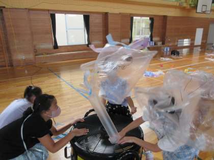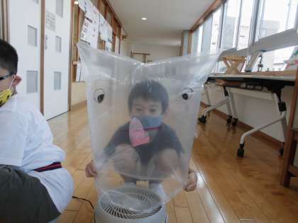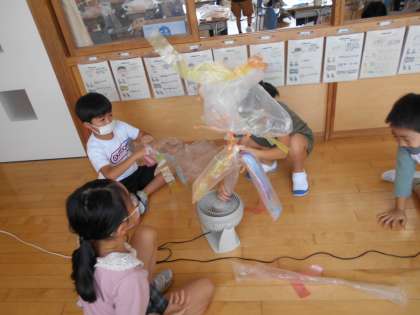 風の力で、浮かんだり動いたりする袋の形を楽しみながら、ポリ袋に色を付けたり、飾りをつけたりしました。自分の作品が思うように動くと、とても喜んでいました。