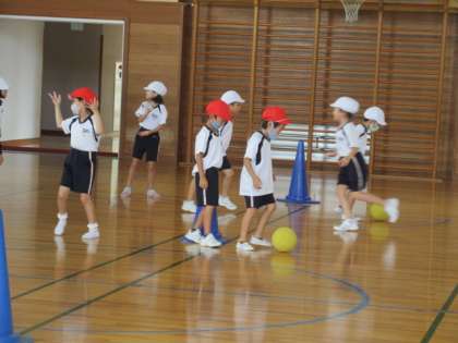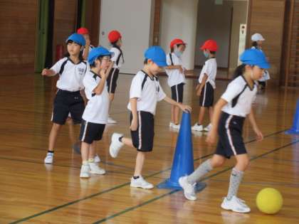 体育でボールを使った運動をしました。的に向かってボールを蹴ったり、ボールを蹴りながら前に進んだりしました。友達のシュートしたボールを足で止めることにもチャレンジしました。