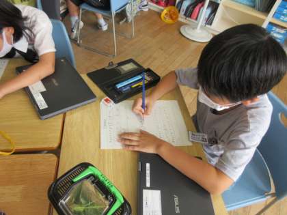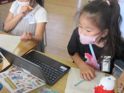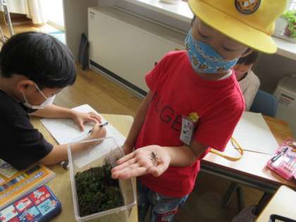 芝生広場や東部っこ山で生き物をさがしました。ダンゴムシやカマキリなどの生き物の動きや体の様子、えさを食べる様子をよく見てみました。実際に見たり、写真にとって見たりしました。また、動画にとることで、カエルが高くジャンプする様子やバッタが高く飛び跳ねる様子を観察することができました。「ダンゴムシのオスとメスの違いがわかったよ!」など新しい発見もしていました。