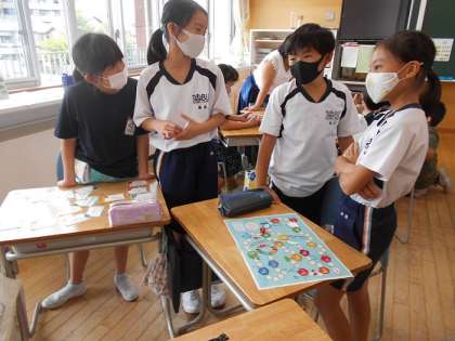 総合の学習で、環境について調べています。今回はより子供たちの理解が深まるように、SDGsの目標がクイズになっているすごろくに取り組んでみました。SDGsという言葉を最近はよく耳にするようになってきましたが、目標項目についてはなかなか子供たちもなじみがないようで、すごろくを進めながら、「こんなことも世界で起こっているのか」と環境問題にさらに関心を寄せていました。