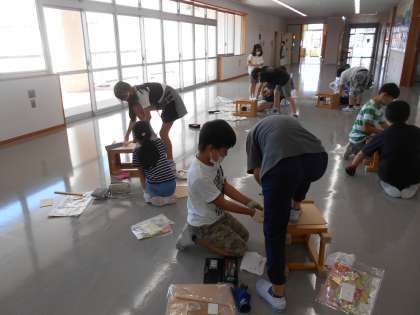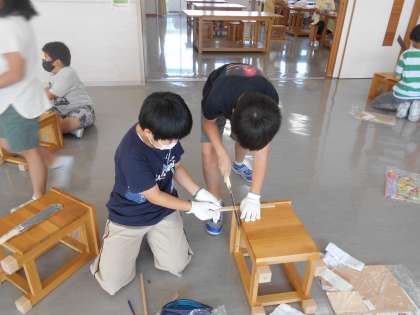 図画工作科では、のこぎりを使って工作をしています。いろいろな大きさ、形に木を切って、それらをつなぎ合わせて作品を作っていきます。子供たちはのこぎりを最初慎重に持って、「どうしよう」と悩んでいる様子でしたが、友達と使い方を一緒に確認しながら、少しずつ体全体を使ってのこぎりを動かせるようになってきました。