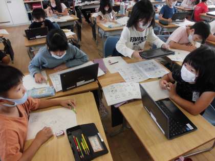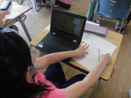 生活科で「うごくおもちゃ」の学習をしています。作ってみたいおもちゃの作り方や遊び方を考えて、図や言葉で分かりやすく書きました。PCで調べたり、友達に聞いたりして取り組む子供もいました。