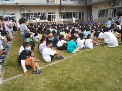 全校で集合写真を撮りました。今度は航空写真を撮ります。色画用紙を持って、カラフルな気球をイメージした写真になるそうです。完成が楽しみです。
