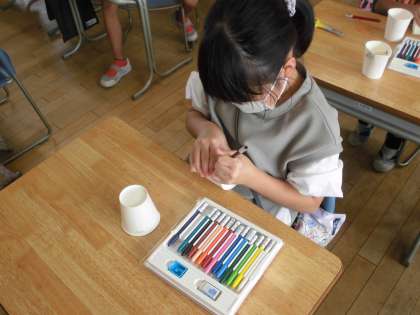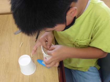 生活科の「うごくおもちゃ」の学習で、みんなで「ぴょんコップ」というおもちゃを作りました。困っていることを話し合い、みんなで解決方法を考えました。その後、それぞれ工夫を加え、「○○さんの考えを生かして、たてとよこに輪ゴムを通したら前より高く跳んだよ」「色をつけたら、跳んだときに綺麗に見えたよ。パワーアップ大成功!」などと振り返っていました。
