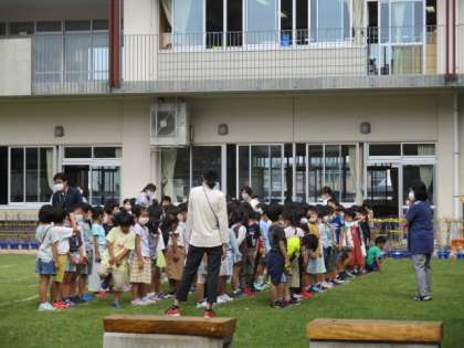 明日はグラウンドで航空写真を撮影します。全校からデザインを応募し、選ばれた作品をみんなで人文字でつくります。