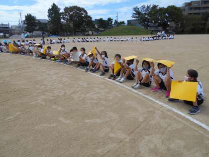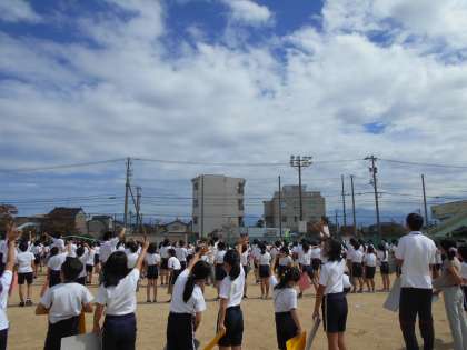 航空写真を撮る飛行機が来るのを今か今かと待っている、帰っていく飛行機に手を振る3年生の様子です。貴重な一日になりました。