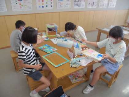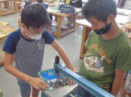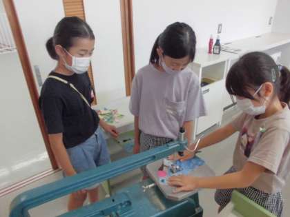 糸のこぎりを使って、オリジナルのパズルを作っています。初めて使う糸のこぎりに緊張しながらも、楽しく製作を進めました。