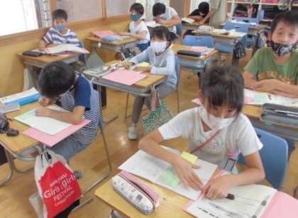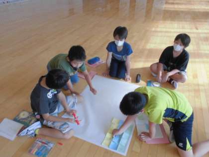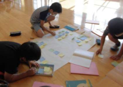 総合で調査したことについて、課題や解決方法を付箋に記入し、グループごとに話し合ってまとめました。次は、自分たちの考えを伝え合う予定です。