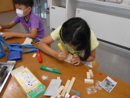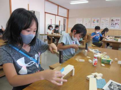 図工の学習で、金槌の使い方を学びました。様々な大きさの木を組み合わせて、動物やロボットなどを作りました。釘を途中まで打って飾りにしたり、釘で模様を表したりしていました。