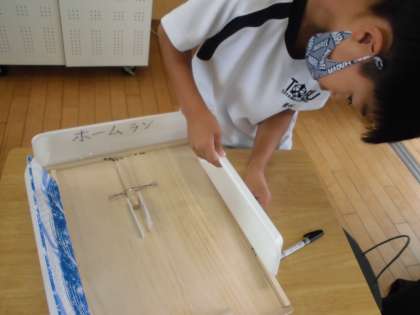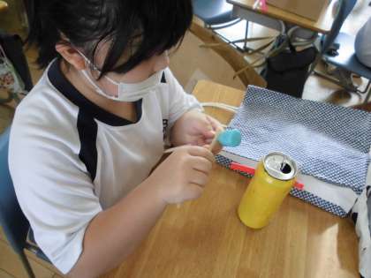生活科の学習で、風やゴムの力で動くおもちゃを作っています。わくわくするおもちゃになるように、何度も試しながら工夫を重ねています。