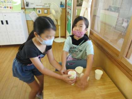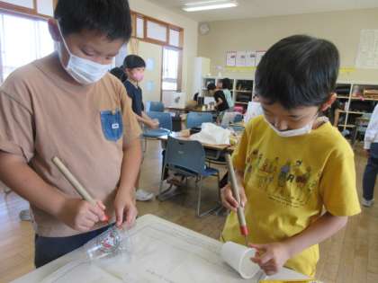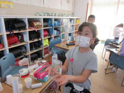 ゴムで動くおもちゃ「ピョンコップ」を作っています。輪ゴムの数やねじり方、重ね方を様々に変えたり、コップの材質や大きさに注目したりしながら、より高くとぶおもちゃを目指して取り組んでいます。また、手の離し方など、遊び方を工夫し、子供たちの思いも膨らんできました。