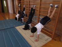 3時間目に、マット指導をしていただきました。ゆりかごやアンテナをして、お尻を上げる練習をしました。それを生かして、前回り・後ろ回りに挑戦し、目線や手の付き方等のコツを丁寧に教えていただきました。子供たちは、「おへそを見て回ったら綺麗にできたよ」「マットの達人になれた!」などと話し、楽しくマット運動に取り組んでいました。