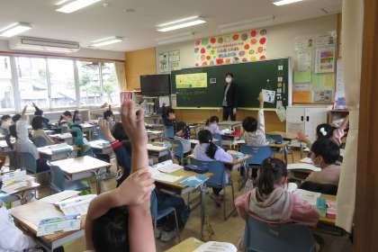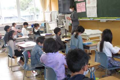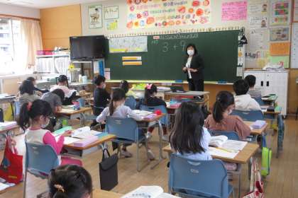 1年生の学習参観では、算数科の学習を行いました。足し算の計算の仕方を学習しています。