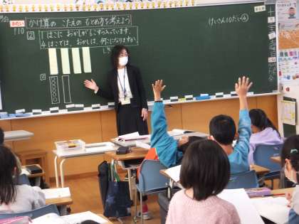 2年生の学習参観では、算数科と国語科の学習を行いました。算数科では、かけ算の計算の仕方を学習しました。国語科では、がまくんとかえるくんの「お手紙」の内容を読み取りました。
