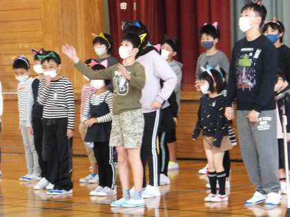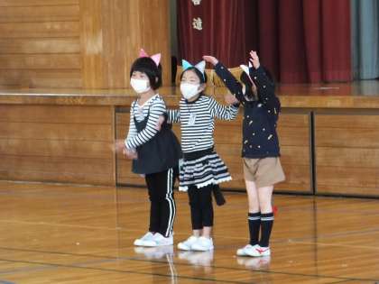 ふたば級、たんぽぽ級では、合同で音楽劇を行いました。全員がねこの姿に変身し、呼吸を合わせながら元気いっぱい楽しく歌を歌ったり演技をしたりしました。