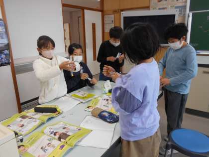 空気について学習しています。今回は空気鉄砲で球を跳ばしたり、注射器を用いて中の空気を押し縮めたりして、空気の体積の変化をみる実験をしました。