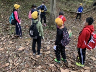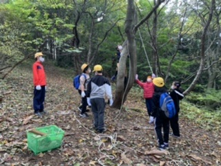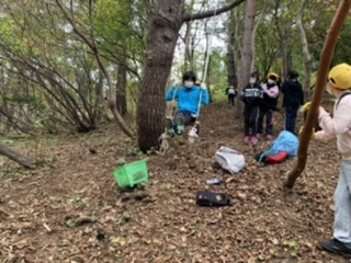 説明を受け、場所を選び班の仲間と遊び場づくりをしています。