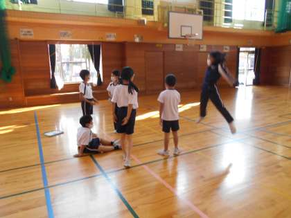 体育で、表現運動をしています。まず、進化ジャンケンやジェスチャーゲームを通して、体全体を使う表現を考えました。