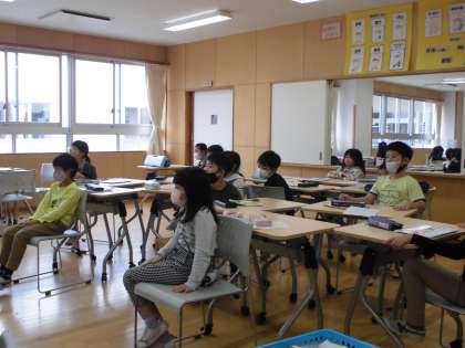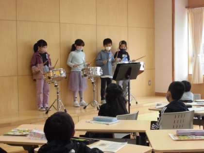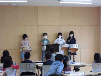 音楽科の時間に、班で作ったお祭りの音楽を発表しました。旋律や強弱を工夫したことで、表現したいお祭りの雰囲気がみんなに伝わり、嬉しそうでした。