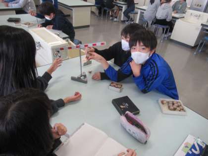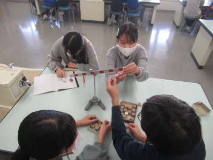 理科では、てこのはたらきについて学習しています。実験用てことおもりを使って、てこが釣り合う時の力の関係を調べました。