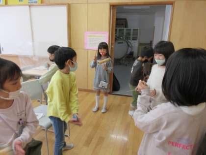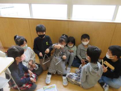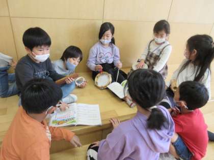 歌に合わせて、楽器の音を重ねて表現する学習に取り組んでいます。「かぼちゃ」という曲に合わせて一人一人が打楽器を使いリズム打ちしました。「どんどん増えていくかんじにしたいね」「だんだん音を大きくしていこう」「最後はみんなでいっしょに打とう」など、鳴らす順番や組み合わせ、強弱を考えました。