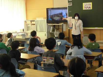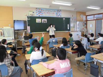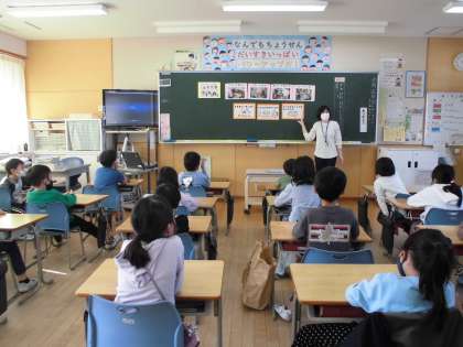 栄養教諭の澤井先生に、残した給食はごみになってしまうことや、調理員さんが、自分たちのことを考えて工夫して給食を作ってくださっていること等を教えてもらいました。子供たちは、給食に携わっている方々の思いに気付き、「毎日残さず食べるぞ!」「いつも本当にありがとうございます」と話していました。
