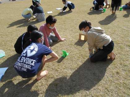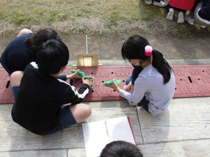 理科で、引き続き太陽の光について学習しています。鏡を使ってはね返した日光の暖かさや明るさを調べました。はね返した日光を重ねるほど、温度が上がっていく様子に子供たちは興味津々でした。