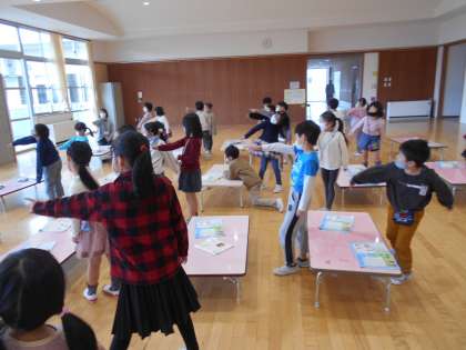 音楽で呼びかけ合う「やまびこさん」を練習しています。