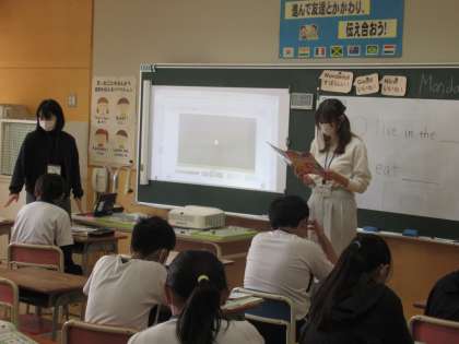 外国語の授業風景です。ALTの先生と随分仲良くなり、英語での会話や質問を楽しみながら頑張って学習をしています。