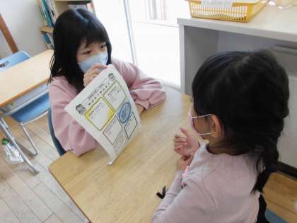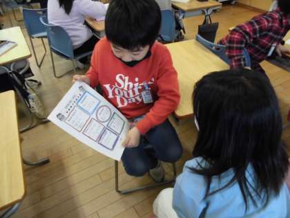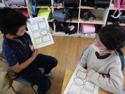 生活科の学習で、2年生の自分を振り返り、できるようになったことや好きなこと等をペアで伝え合いました。発表が終わると、友達に「毎日寝る前に九九を唱えているから、すらすらに言えるようになったんだね。すごいよ!」「大縄飛びが好きなんだね。今度一緒に遊ぼうね」などと言葉をかけてもらっていました。