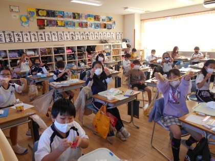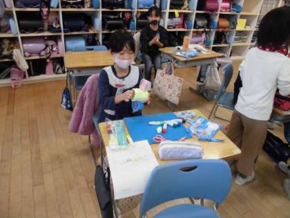 図工の学習で、ペットボトルや瓶に紙粘土をつけて、小物入れに変身させています。ふわふわの紙粘土の感触を楽しみながら、絵の具で色をつけて、かわいい小物入れを作っています。