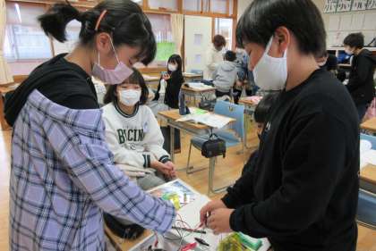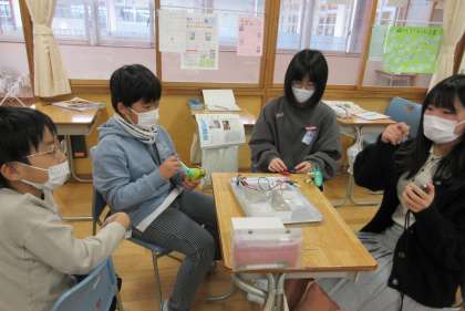 手回し発電機を使って発電し、電気が光と熱に変わることを確かめました。自分たちの手で電気をつくり出せることもおもしろかったようです。