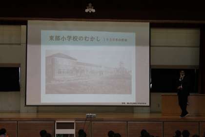 校長先生が、東部小学校の歴代の校舎の写真をスクリーンに映しだしながら、お話をしてくださいました。写真から、建物や校舎の建っていた場所が少しずつ変わっていたことが分かりました。